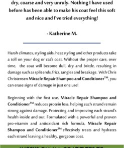 Trænger dybt ind i hårrødderne, og virker dermed indefra for at forhindre beskadigelse af det enkelte hårstrå. Allerede fra første behandling med Miracle Repair Shampoo reduceres proteintab fra pelsen, og styrker hvert enkelt hårstrå, beskytter mod beskadigelse og får pelsen til at fremstå sund, skinnende og nem at håndtere.